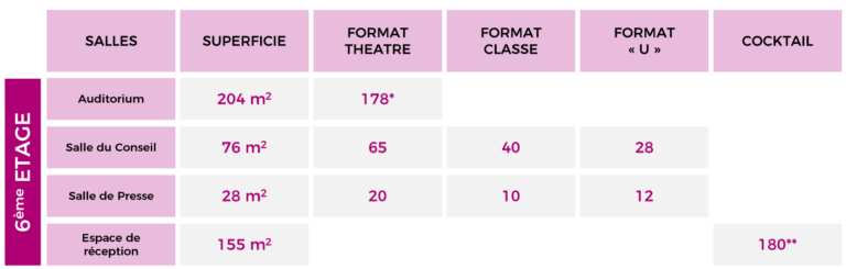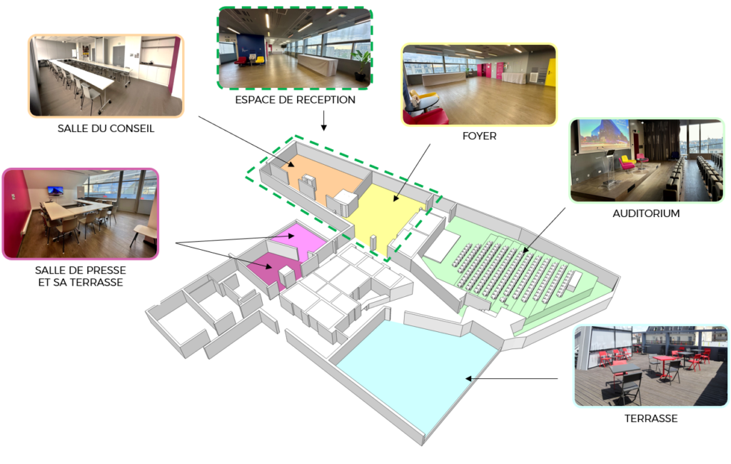 ** Espace loué avec l’auditorium, capacité indiquée incluant l’ouverture sur la salle du Conseil